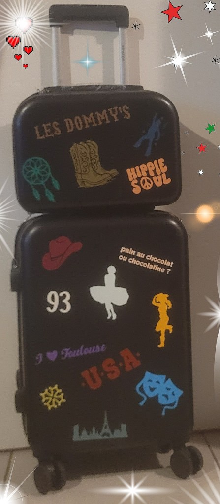 Sur cette valise comme vous pouvez voir, il y a tout ce qui me représente à 100%.