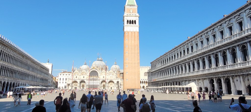 Sur la place St Marc, je filme en tournant sur moi même. La basilique est superbe. Un petit tour de l’Horloge de Saint Marc, un incontournable de la place.