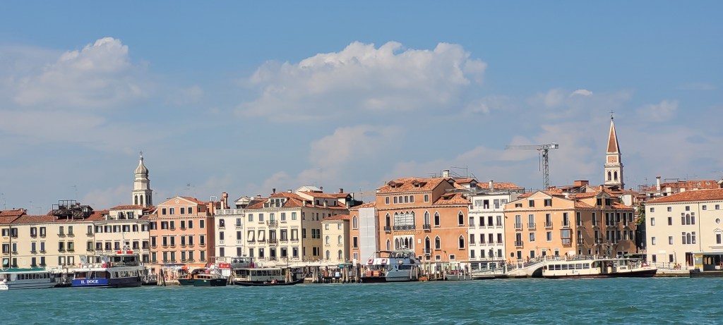 Les déplacements se font en bateau « vaporetto » même pour faire ses courses. Nous avons apprécié le cadre, les ruelles, les places, les petits ponts partout , les boutiques, les restos , les terrasses. Un véritable labyrinthe. Oui c’est sûr, pas de place pour une voiture, un vélo et une trottinette. Beaucoup d’escaliers !!!!!!!!!! mais c’est tellement beau.